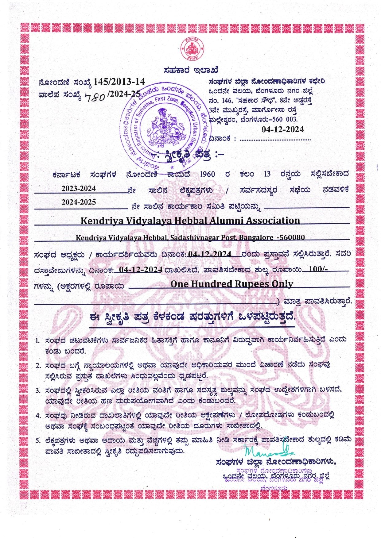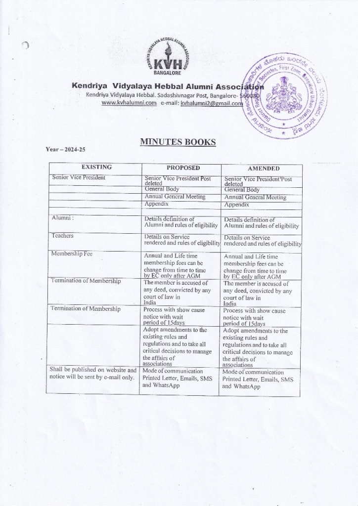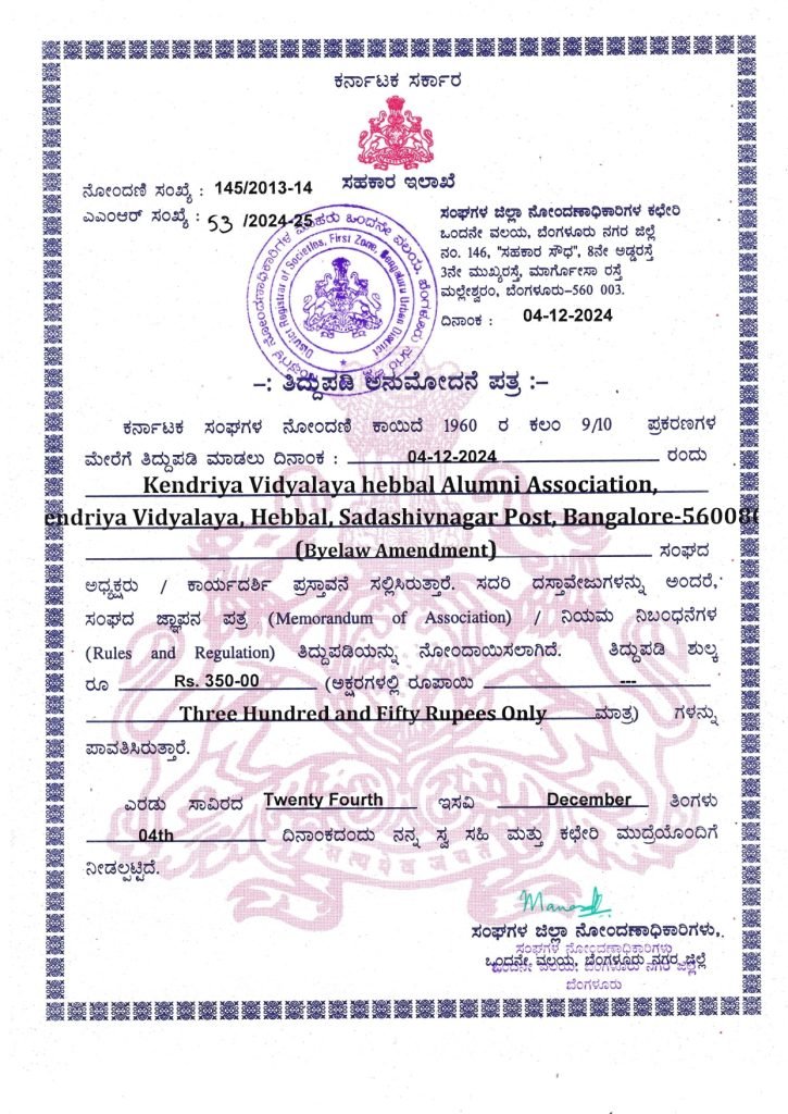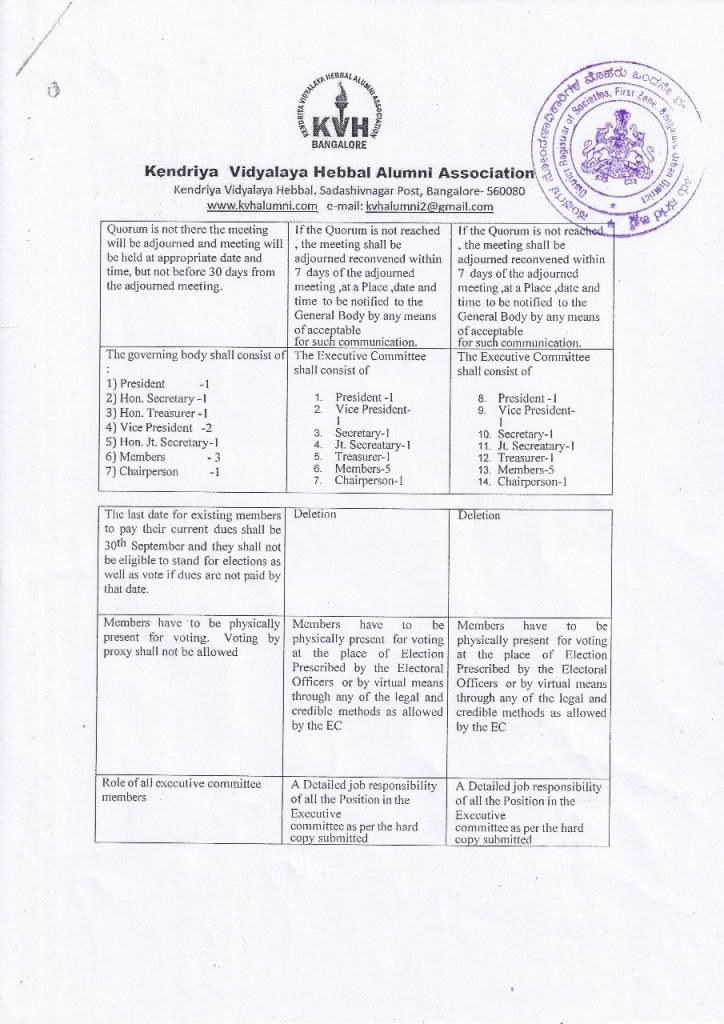 The Kendriya Vidyalaya Hebbal Alumni Association (KVHAA) is a duly registered alumni body in Bengaluru, Karnataka, India, founded in 2012-13. It is made up of the General Body of former students (who have joined the Association as registered and Voting Life Members) and former teachers (who have joined as honorary and Non-Voting Life Members), who have come together to celebrate, sustain, develop and expand the bonds of togetherness they enjoyed during their time at the school. It is a not-for-profit organization, which is managed by an Executive Committee comprising a President, Vice President, Secretary, Joint Secretary and Treasurer, and five other Life Members, all drawn from the General Body. The Principal of KV Hebbal assumes the role of the Ex Officio, Non-Executive Chairman of the Executive Committee. KVHAA continues to grow steadily, and aims to serve the Alma Mater and its fellow members, in pursuit of its Vision, Mission and Goals, all the while trying to remain compliant to its chosen core values that include Integrity, Inclusivity, Respect, Impact, Excellence and Transparency.
